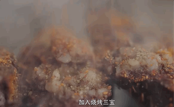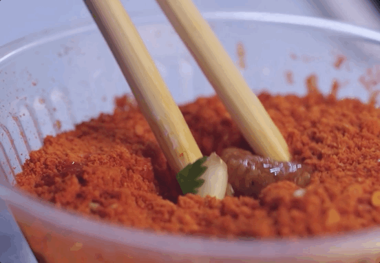 在由花生碎、辣椒、芝麻组成的干料里打个滚,浓烈的油香肉香迅速钻进口腔,又麻又香又辣,十分弹牙。