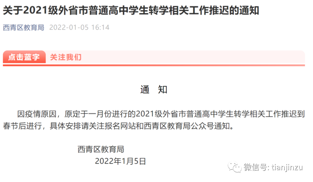 因疫情原因,原定于一月份进行的2021级外省市普通高中学生转学相关工作推迟到春节后进行,具体安排请关注报名网站和西青区教育局公众号通知。