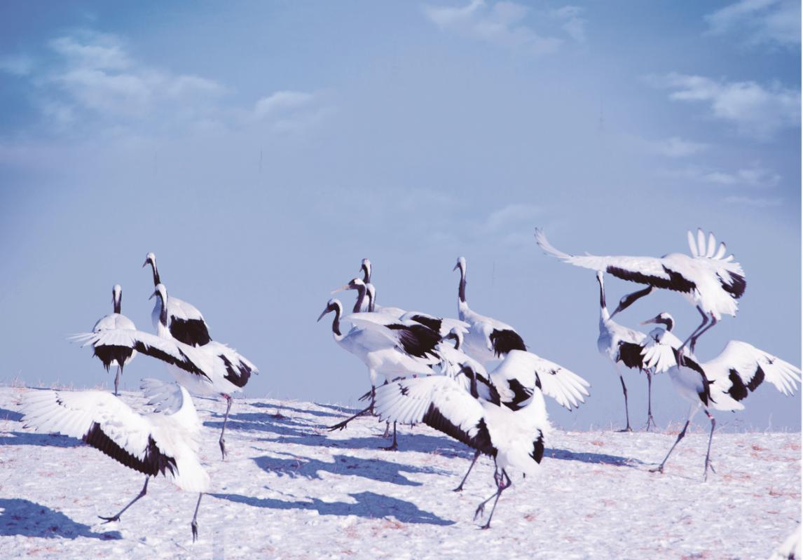 齐齐哈尔雪地观鹤节,欣赏鹤舞雪原,品尝美味烤肉。
