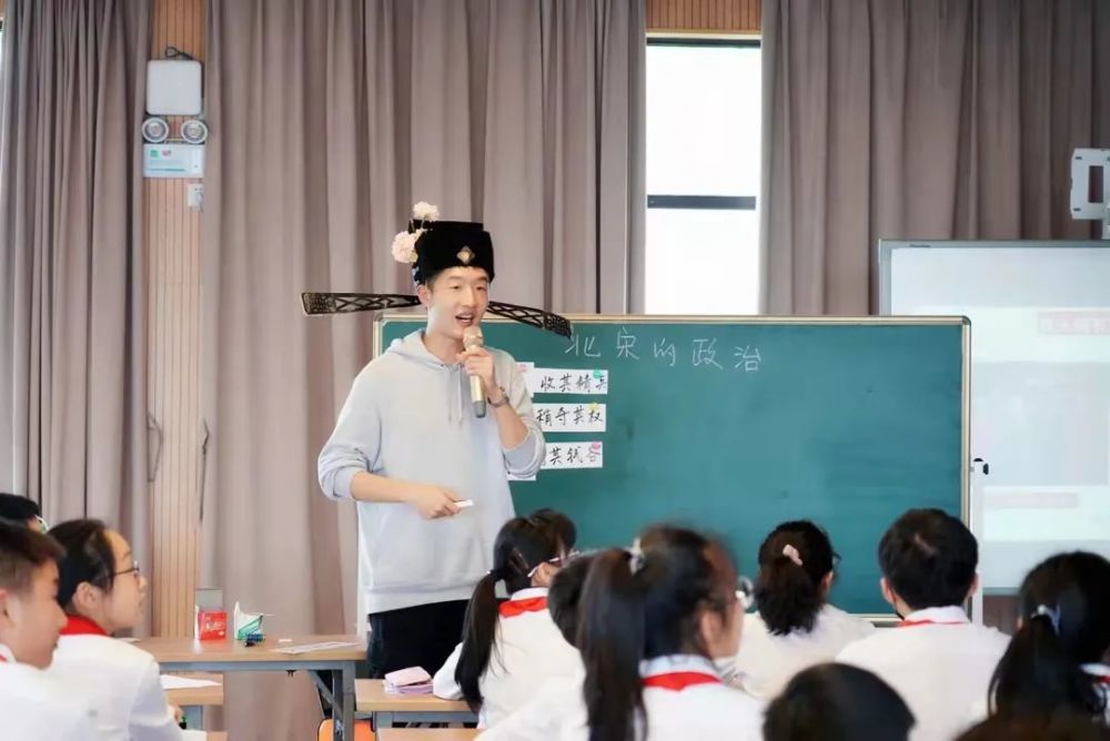 在他的课堂上,学生总感觉自己穿越了时空,在和历史对话。课上,张老师戴上自制幞头帽,从这顶帽子说起,再将北宋的政治娓娓道来;他还会身穿长衫化身“陈万运”,带领学生“穿越”回民国,探索近代社会生活的变迁……因此,他的课堂总是充满欢声笑语。