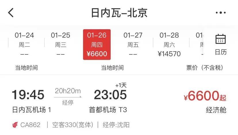 国航自1月26日起将复航瑞士日内瓦-北京航班,沈阳为第一入境点。