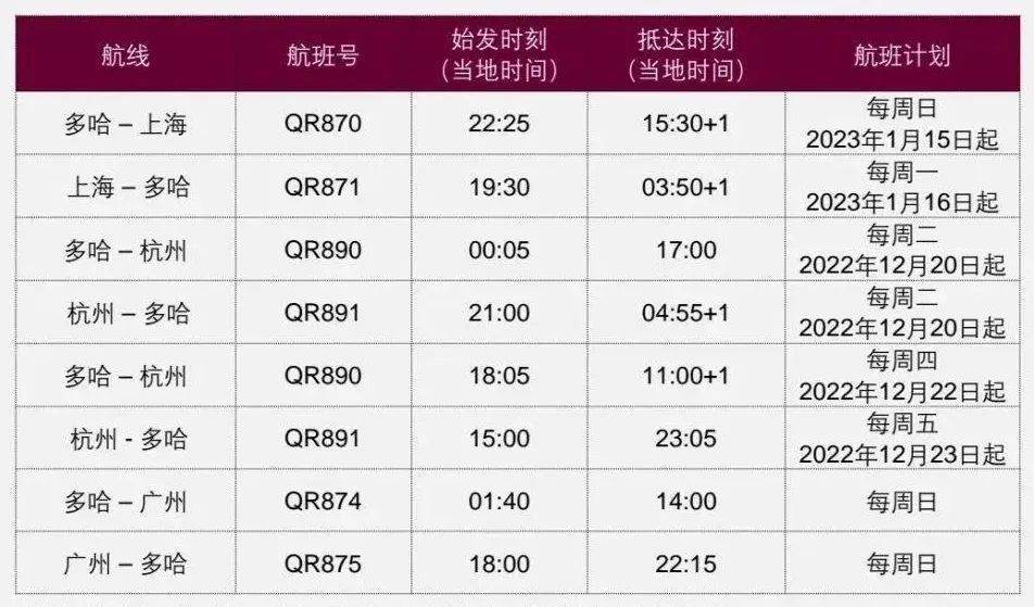 卡塔尔航空从1月15日起恢复每周1班往返多哈和上海浦东的航班,3月28日恢复多哈-重庆、多哈-成都航线。