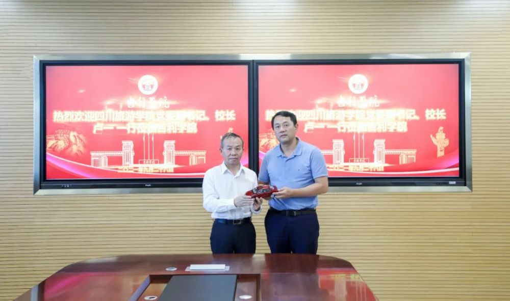 我校执行校长阙海宝向四川旅游学院党委副书记、校长卢一赠送纪念品