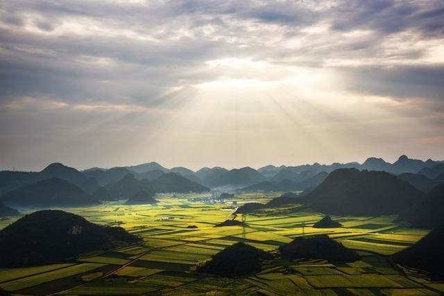 一般推荐的是县城东北方向的金鸡峰。登上金鸡峰,看油菜花田比较平坦,而稍远处有些孤峰拔起,很壮阔的感觉。很多罗平花海的照片都是这里拍的