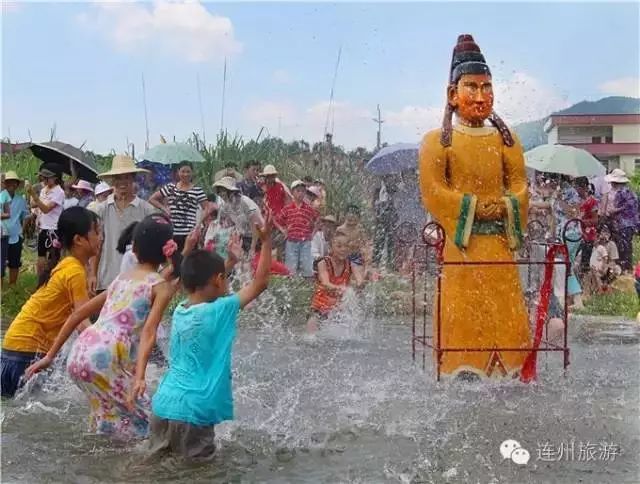 洗佛节盛行于连州沙坊村一带,每年六月六日,就要将庙里的菩萨抬到河里洗晒一番。仪式开始,先是游神祈福,由道士率领着“八音”鼓乐队吹打引路,来到村边的东岳庙,将诸神“请”出来。一路游行,依次摆放到村里的五座门楼前,然后摆上祭品,再由道士念经祈福。在鼓乐声中,神佛们被扛抬到村前的小龙河中央,大人小孩一起替神佛洗浴。仪毕,村民再将众神佛簇拥着送回村前的东岳庙。