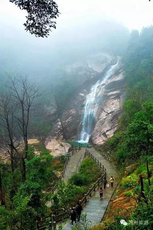 大东山温泉瀑布位于连州城东北38公里处,在大东山的环抱之中。大东山海拔1450米,气势雄伟。密林中,两条小溪顺山而下,其中一条雾气蒸腾的是温泉,其为重碳酸钾热矿泉,有健肤美肤之功效。