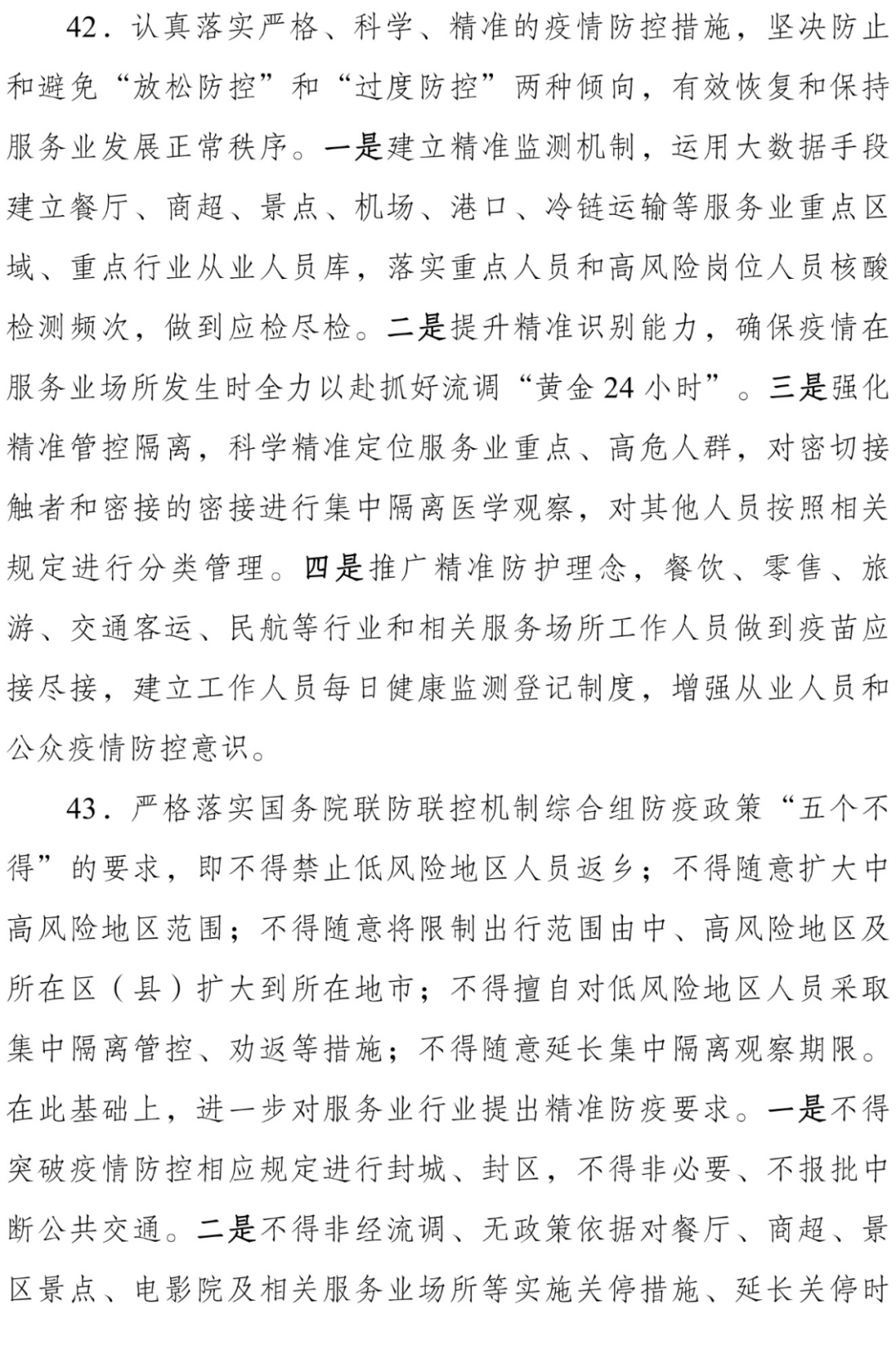 《若干政策》还就精准实施疫情防控措施提出针对性措施,明确提出要认真落实严格、科学、精准的疫情防控措施,坚决防止和避免“放松防控”和“过度防控”两种倾向,有效恢复和保持服务业发展正常秩序。在严格落实国务院联防联控机制综合组防疫政策“五个不得”要求的基础上,进一步针对服务业行业提出“三个不得”精准防疫要求,即不得突破疫情防控相应规定进行封城、封区,不得非必要、不报批中断公共交通;不得非经流调、无政策依据对餐厅、商超、景区景点、电影院及相关服务业场所等实施关停措施、延长关停时间;不得在国务院联防联控机制政策要求基础上擅自增加对服务业的疫情防控措施。