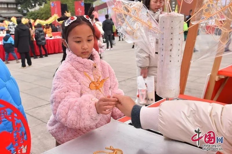 非遗项目展示和体验区,引来众多游客群众围观体验,不时与同伴或艺人交流询问。天鹅蛋、洛带草鞋、张斯特砭术、糖葫芦、毛婆婆凉粉、永田陶埙、糖画、捏泥人、吹糖人、秋歌擂茶等非遗项目令人眼花缭乱。写春联·送祝福、迎新春·剪窗花、新春汉服秀、新春非遗展、新春读书和年货展活动区域,也是热闹非凡,不少游客表示,在这里看的、吃的、玩的、用的一应俱全,年味十足,让人流年忘返。