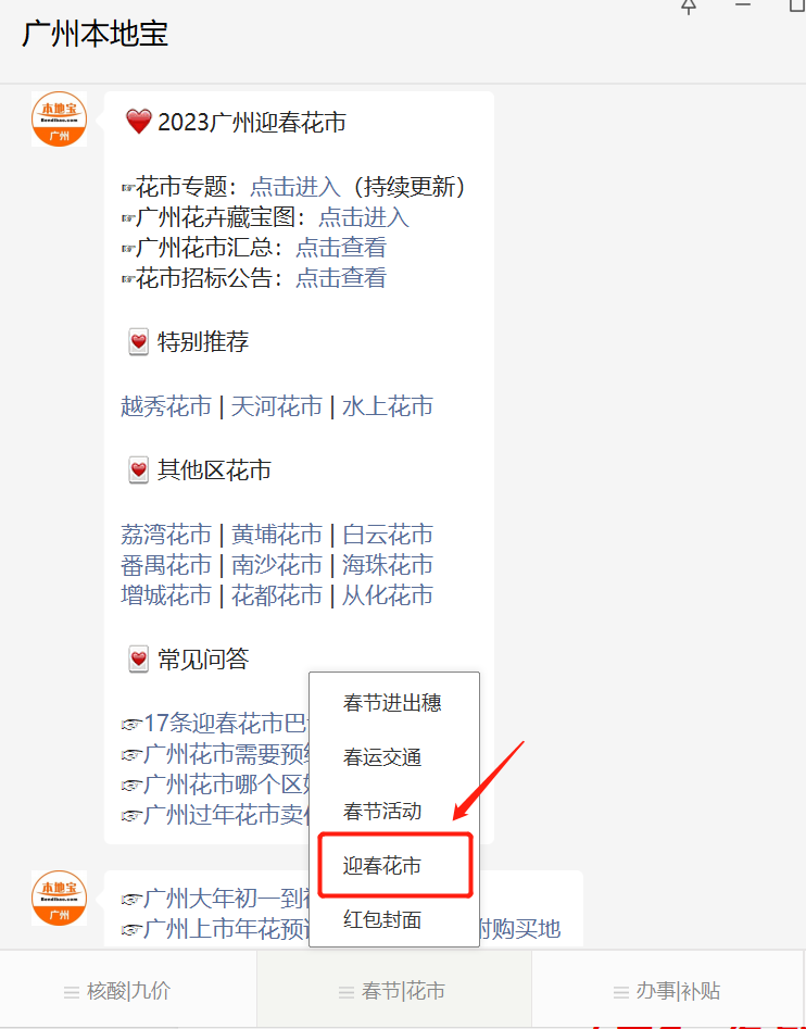 ?可以在微信公众号首页下方菜单栏点击核酸丨九价,春节丨花市,办事丨补贴获取你想看的内容