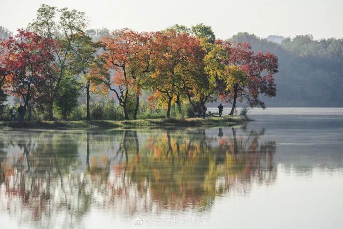 相比“最美600米”,前湖的秋景并不逊色,这个时节的乌桕树已经红了,湖水倒映下,宛如一幅水墨画,美得让人挪不开眼。