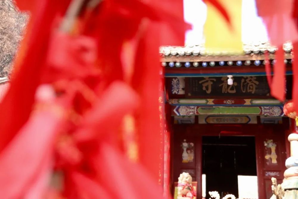 潜龙寺门前飘扬着红色祈福丝带