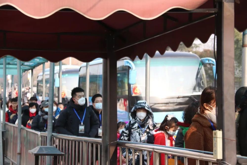 游客们有序排队乘坐大巴车进入景区