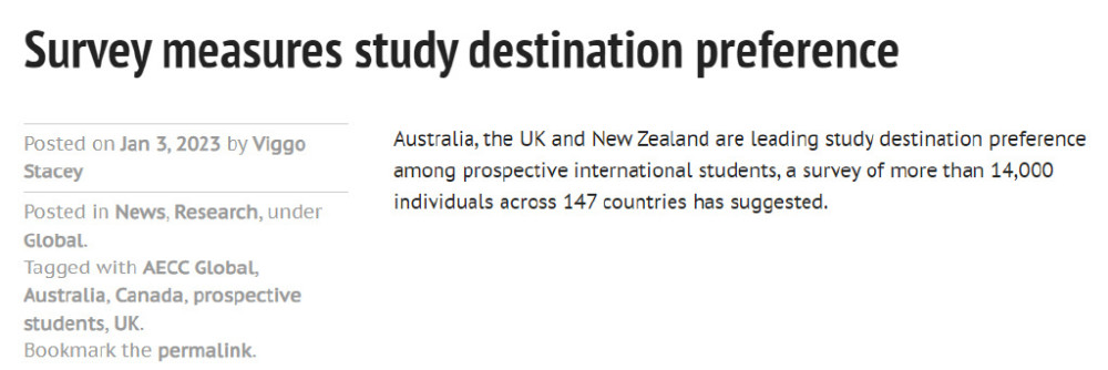 咨询机构AECC近期发布了一份2022年全球留学趋势报告(AECC Insights student survey),调查了来自全球147个国家和地区的超14000位学生的留学意向。