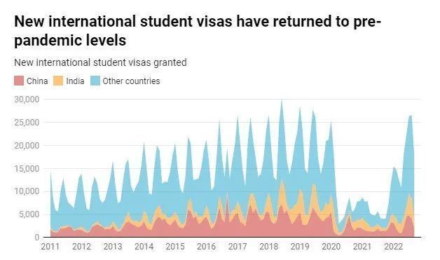 2022年申请澳洲学生签证的中国学生和印度学生已经回升许多,其他来源国学生申请数量更是猛增。