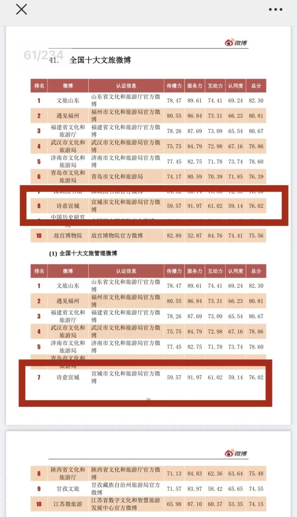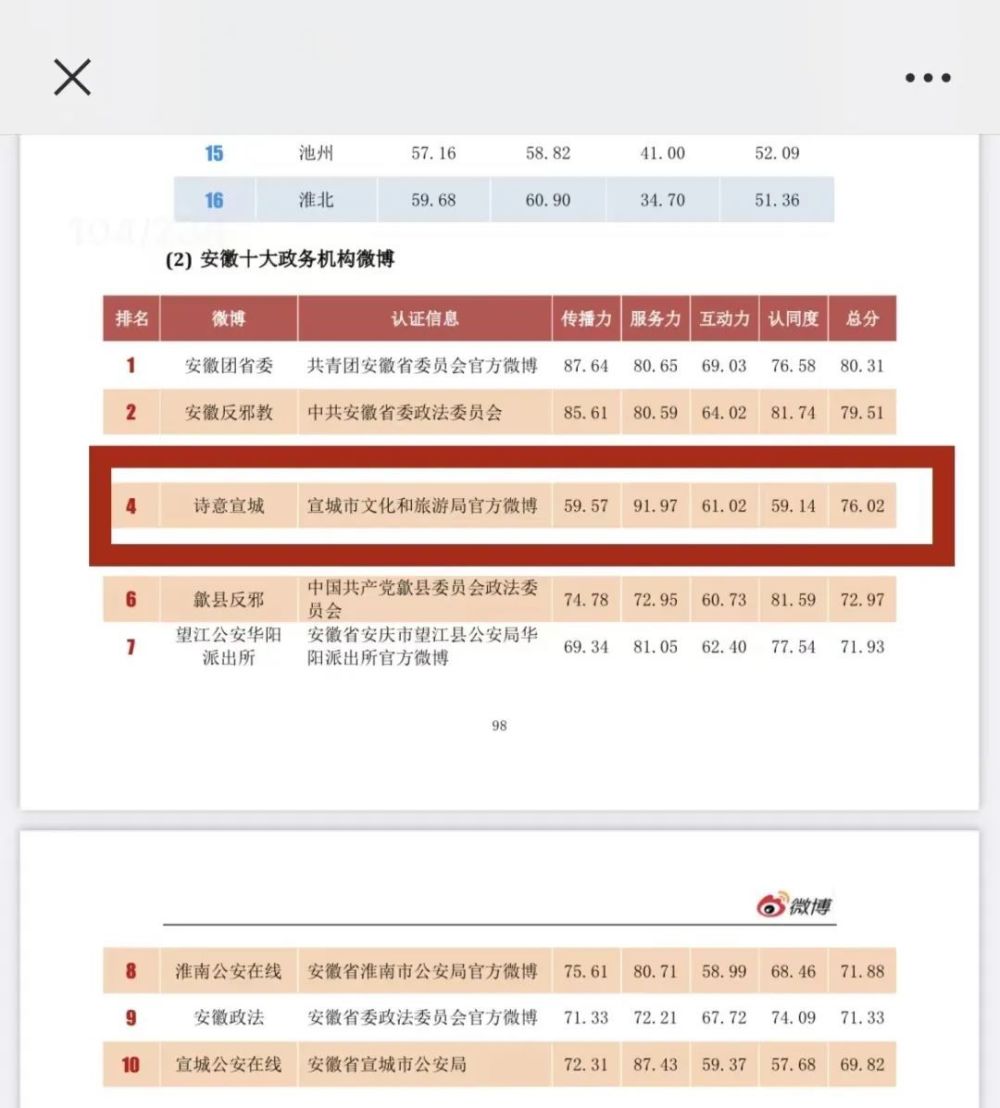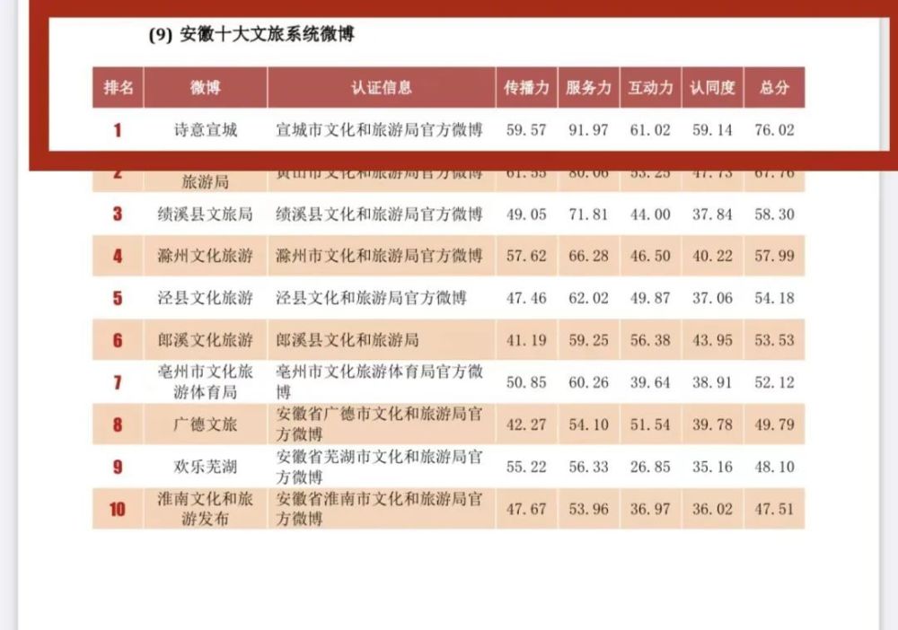 该排行榜由人民网舆情数据中心提供学术支持,数据统计周期为 2022年1月1日至2022年12月31日,评价对象包括全国所有通过微博认证的机构官方微博,评价体系包括四个维度:传播力、服务力、互动力和认同度。其中,“2022年上半年政务微博影响力报告”“诗意宣城”官方微博荣获:全国十大文旅微博第9名;全国十大文旅管理微博第8名的好成绩。第三季度更是荣获:全国十大文旅微博第5名;全国十大文旅管理微博第5名的骄人成绩。