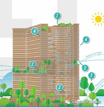 “会呼吸的建筑”概念非常简单,在建筑设计上引入自然的空气流动。透过自然气流和动力,所引入的自然空气便在建筑物中循环,自然通风。通过中庭和其他建筑的空间设计,使得气流向上流动。自然空气通过联通通风口和通道分布到所有楼层及单位,达到真正的通风效果。