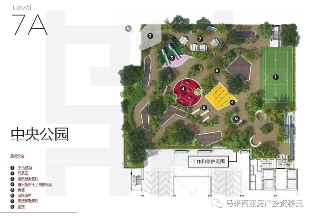 1、羽毛球场2、观景区3、游乐场滑梯区4、游乐场秋千区/跷跷板区5、步道区6、庭院座椅区7、烧烤区和野餐区8、座椅区