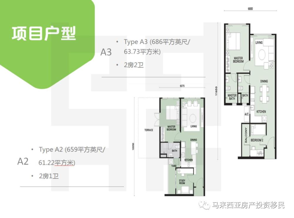 l项目户型:659-1,278平方英尺(套内面积61.2-118.7平方米)2房~3房