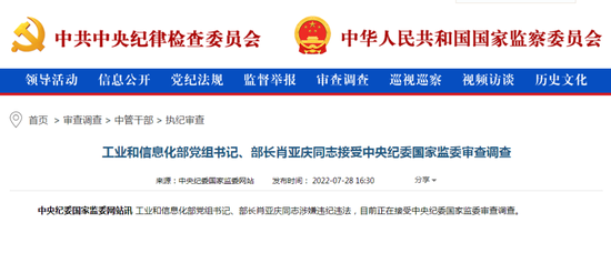工业和信息化部党组书记、部长肖亚庆同志涉嫌违纪违法,目前正在接受中央纪委国家监委审查调查。