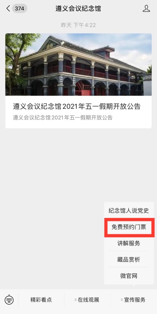 一、微信搜索:“遵义会议纪念馆”服务号,菜单找到“免费预约服务”