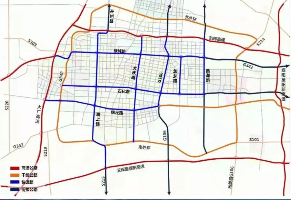 其中,“田字放射”是由绿城路、石化路、铁丘路构成的三条横向快速路以及濮上路、大庆路、G106构成的三条纵向快速路。