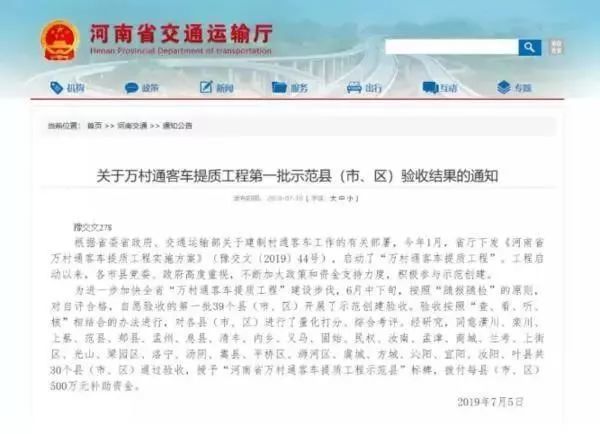 河南潢川、栾川、上蔡、范县等共30个县(市、区)被评为万村通客车提质工程示范县。