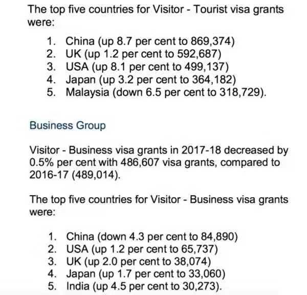 澳洲移民局官方数据也显示,在2018年7月1日至2019年6月30日,来自中国赴澳洲的旅游签证中