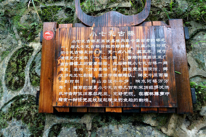 小七孔古桥。这是一座小巧玲珑的七孔古石桥,桥长25米,桥面宽4米,拱高4米,建于清道光15(1836)年,昔为沟通荔波至广西的重要桥梁。桥由麻石条砌成,桥身爬满藤蔓和蕨类;古色古香的桥下是绿得令人心醉的涵碧潭。两岸古木参天,巨大的虬枝沿着桥伸臂,宛如巨伞撑在桥上。