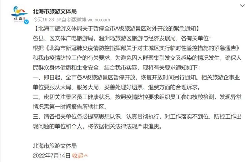 广西北海市旅游文体局14日晚通报,当日起,全市各A级旅游景区暂停开放,恢复开放时间另行通知。