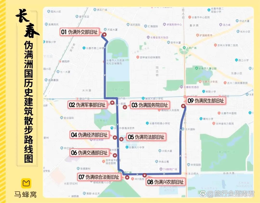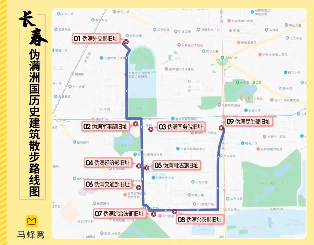 10、人民广场:建于1933年,最初是依据霍华德的田园城市理论建造,名字为大同广场,1945年苏军进驻长春,改称斯大林广场,1946年改称中正广场,长春解放后,改称为人民广场。