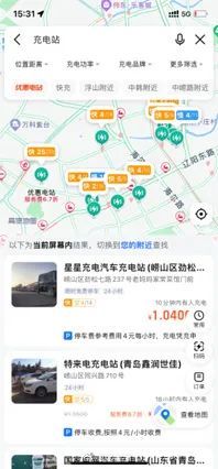 用户进入山东省后,只需要打开高德地图APP,在首页搜索“充电站”,就可以在地图上查看自己所在地附近的充电站以及相关实用信息,包含充电站的所属品牌、充电功率(快充/慢充)、具体位置、充电桩的闲忙实时状态、停车费用等,并可以实现一键导航前往。