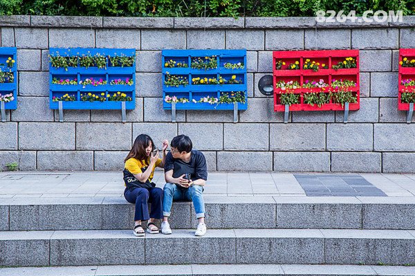 清溪川一河两岸坐着不少首尔市民,从建成之日起,这里就是首尔市民悠闲的好去处。当然也是情侣们恋情说爱的好地方,她有点小害羞却又无限喜悦地和身旁的他坐在清溪川畔。