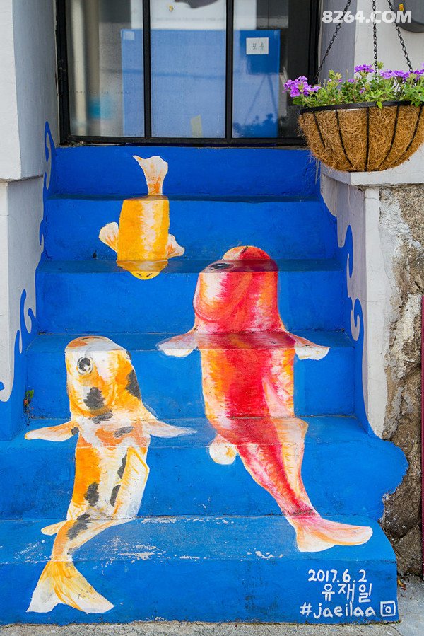来之前做资料搜集的时候,知道梨花洞壁画村在2016年6月中旬,梨花洞的居民们因不堪被每日络绎不绝的游客的打扰,他们在壁画上用红色喷漆写上反对标语,并且清除了部分壁画,包括梨花洞村最著名画着三条鲤鱼的阶梯。我也相信游客的到来会对这里的居民造成影响,但同时也给他们带来无限商机,一瓶在外面超卖800韩元的纯净水,在这里可以卖1000韩元的啊!梨花洞村内数量众多的咖啡馆与工艺品店,也是因大量涌来这里的游客所衍生出来。