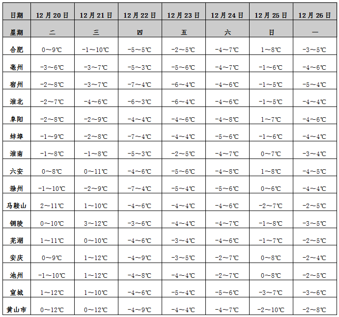 未来一周,安徽以晴到多云天气为主。受冷空气影响,22日全省平均气温将下降3~5℃,同时偏北风力增大到3~4级,阵风7级,冷空气过后,23-24日早晨最低气温:淮北地区和江淮之间北部-7~-5℃;其他地区-6~-4℃。