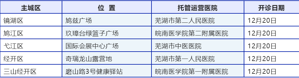 芜湖的广场(方舱)便民发热门诊已于12月20日下午正式投入使用,主要服务于14周岁至65周岁、无基础疾病、非急诊、无有创治疗的、普通发热患者或有上呼吸道症状的患者。每天上午8:30-12:00,下午1:30-5:00开诊。