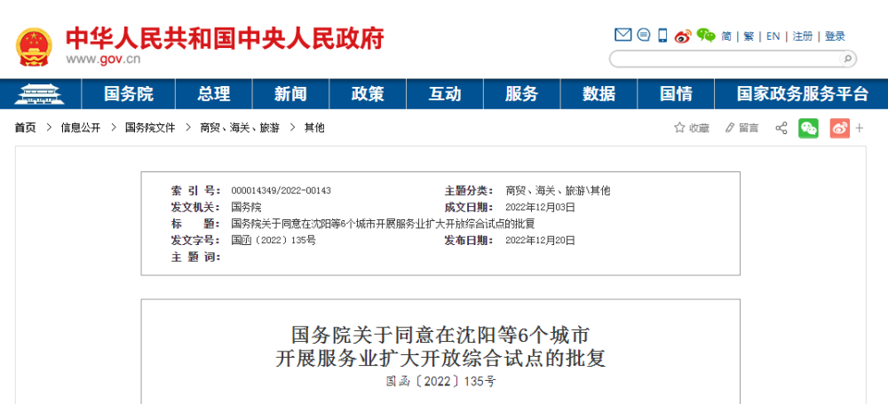 国务院近日批复同意在沈阳市、南京市、杭州市、武汉市、广州市、成都市开展服务业扩大开放综合试点,试点期为自批复之日起3年。