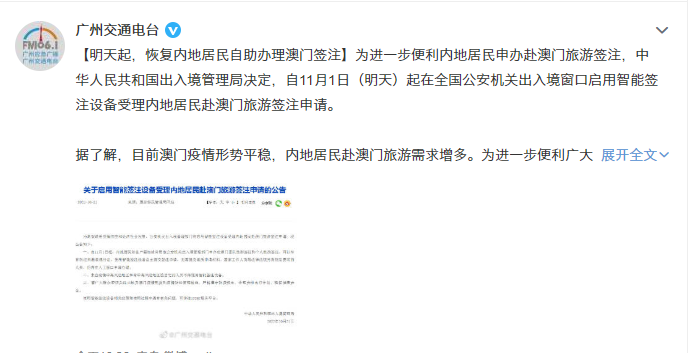 为进一步便利内地居民申办赴澳门旅游签注,中华人民共和国出入境管理局决定,自11月1日(明天)起在全国公安机关出入境窗口启用智能签注设备受理内地居民赴澳门旅游签注申请。