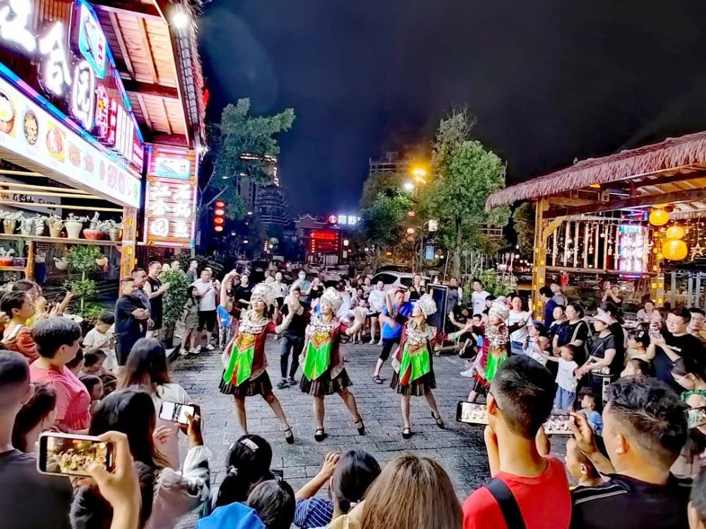 荔波古镇位于荔波县玉屏街道,以樟江为依托,融入少数民族文化,正持续打造夜间经济集聚区。去年,进入旅游旺季,荔波古镇推出“流光溢彩·荔波夜”系列表演活动,既有少数民族的歌舞、婚俗情景表演等街区表演,也有专业的舞台魔术、杂技、武术等。借助“流光溢彩·荔波夜”活动引流,进一步激活夜间市场活力。荔波古镇共计接待游客35.41万人次,古镇内民宿平均入住率达95%以上。