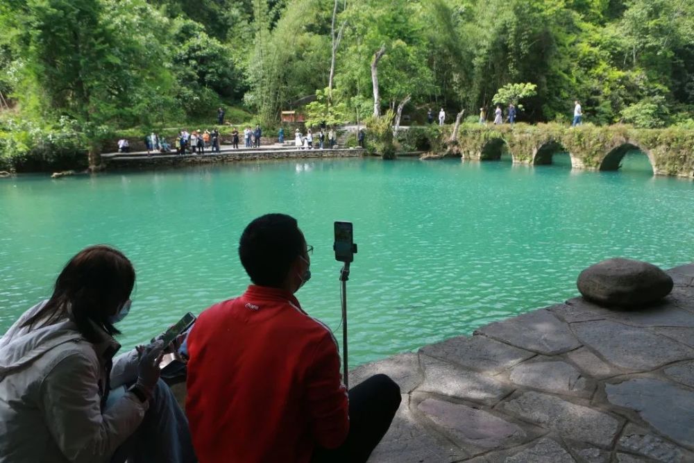 在荔波小七孔景区内,导游们每天上午十点都会在景区的官方抖音号上进行直播,盘活了因为疫情期间游客减少而闲置的导游资源。