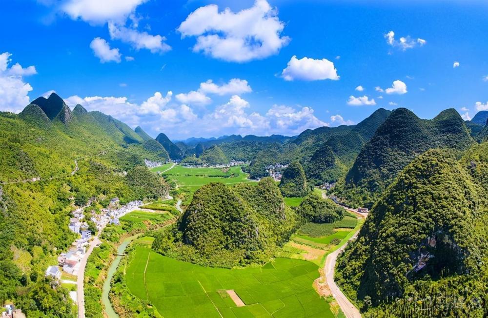 一座座奇美的山峦,与碧绿的田野、弯曲的河流、古朴的村寨、葱郁的树林融为一体,构成大自然中最佳的生态环境,形成天底下罕见的峰林田园风光。