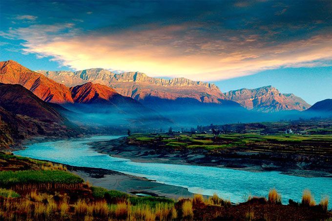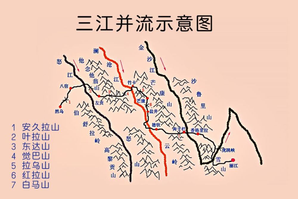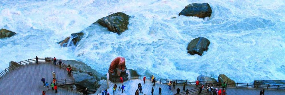 虎跳峡分为上虎跳、中虎跳、下虎跳3段,共18处险滩。江面最窄处仅30余米,万里长江在此被玉龙、哈巴两大雪山所挟峙,江水避关夺隘,惊涛骇浪在深峡中激荡奔涌。