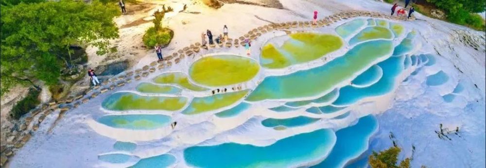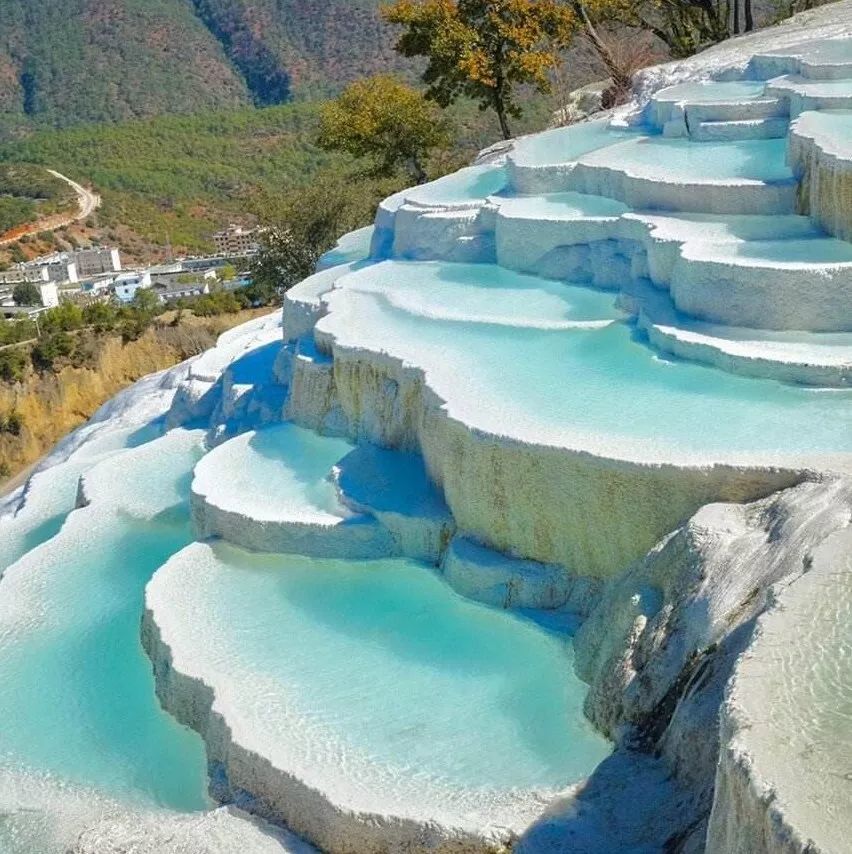 白水台海拔约有2380米,其造型酷似一层层梯田。成因是由于水中的碳酸氢钙经太阳光照射,水分蒸发后形成碳酸钙白色沉积物,之后又不断覆盖地表而形成的泉华地,因此是中国最大的泉水台地之一。