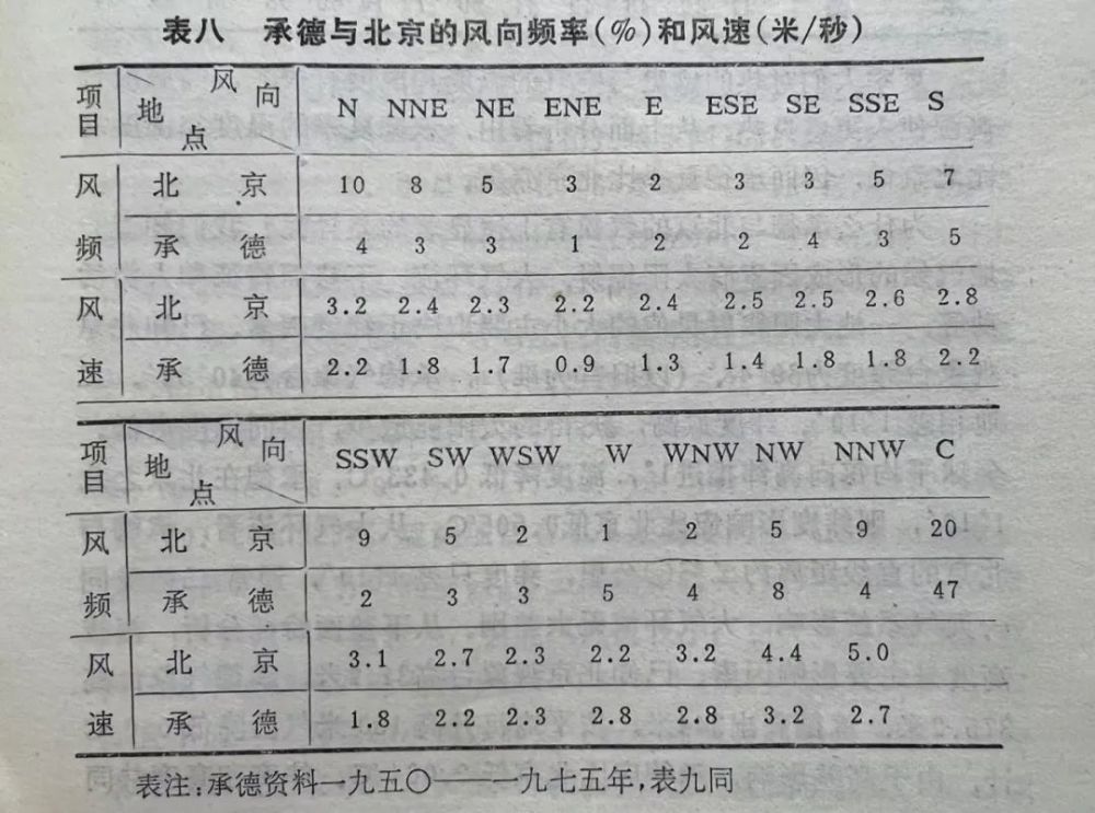 承德的风与北京的风相比,年各风向频率值一般是承德小于北京,而静风频率是承德的远大于北京,是北京的2.33倍。各风向风速除西风外,均是承德的小于北京,年平均风速北京为2.5米/秒,承德为1.4米/秒,承德比北京小44%。