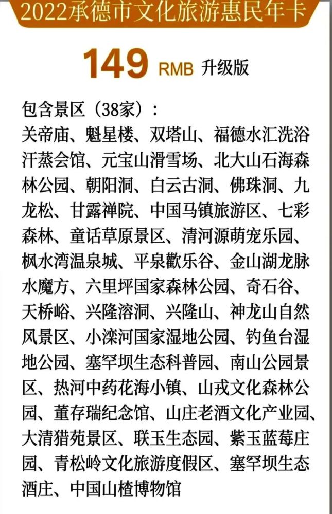 承德市智慧旅游发展有限公司为促进承德旅游市场回暖,推出2022版《149、199、269元承德市文化旅游惠民年卡》,景区景点分别包括:
