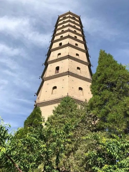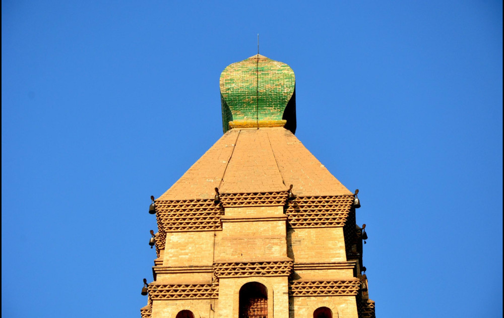 海宝塔在银川市北郊宝塔寺内,俗称北塔、黑宝塔,与银川市内西南角的承天寺塔遥相对峙。海宝塔寺坐西朝东,现存佛殿建于清末。寺中主要建筑有山门(已毁)、接引佛殿、大佛殿、韦陀殿、卧佛殿等。海宝塔建在大佛殿和韦陀殿之间,建在一个砖砌方形台基上,四周有砖砌栏干。台基前,有石阶可上,后有天桥通韦陀、卧佛殿。塔座高4.2米,边长15米。塔身9层,包括塔刹高约54米。塔刹为桃形四角攒尖式,用绿色琉璃砖砌筑。塔身内部呈十字形,是由四个对称的砖砌实体,通过四个拱券联接而成。