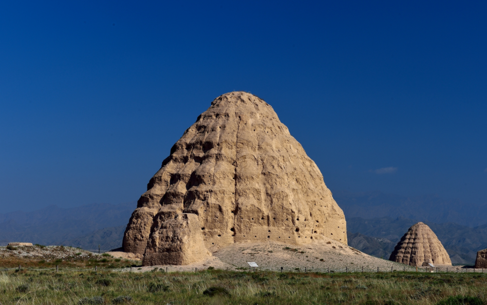 西夏王陵位于银川市西贺兰山东麓,共有8座,为西夏王李元昊(1032年建立西夏国)及其祖父、父亲和以后诸王的陵寝。墓皆平地营造,坐北向南。现存碑亭台基和献殿遗址。陵台有圆形和八角形两种,皆为五级,每级构椽覆瓦,兼施绿色琉璃瓦件,高约17~20米不等,外形颇似佛塔。每个王墓陵园面积均在10万平方米以上,可想当年规模之宏大。