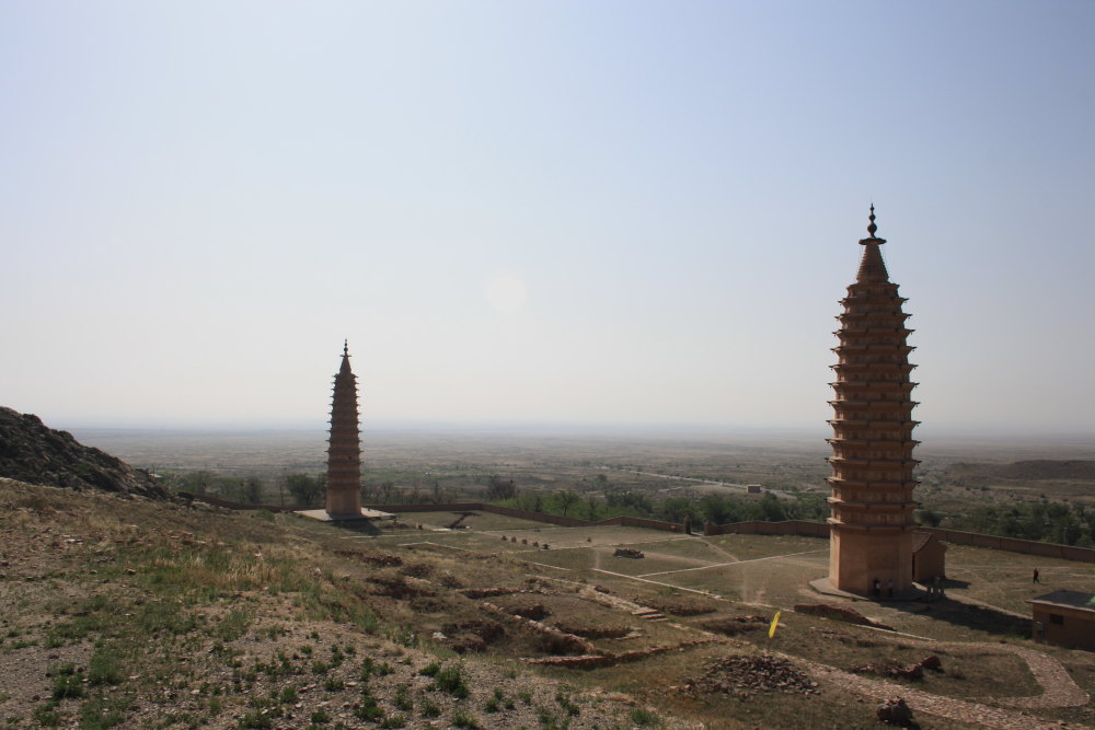 在贺兰山东麓的拜寺口,两塔东西相对,距离仅100米。东塔平面呈八角形,塔身为13层。第一层较高,二层以下逐步缩短,塔内为厚壁空心式木板楼层结构,原有木梯可以上下,现已毁。西塔为14层,除第一层外,其余各层檐下正中设有浅龛,颇有特色。