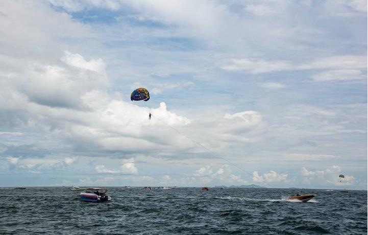 去芭提雅千万别被市区近海的海景迷住了,比起单纯欣赏海景,各种海上娱乐设施才是游客的最爱,比如海上冲浪、海底漫步、潜水、滑翔伞、乘坐长尾船、香蕉船等。