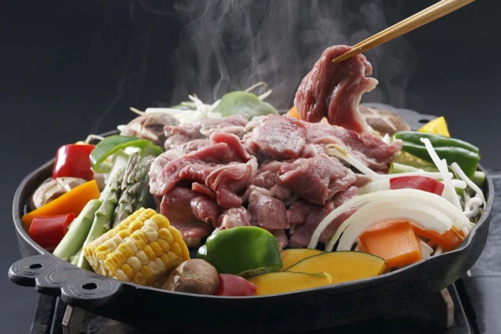 “成吉思汗”的烧烤方法是先将羊肉放在锅子中间,四周摆上一圈蔬菜吸收肉汁。