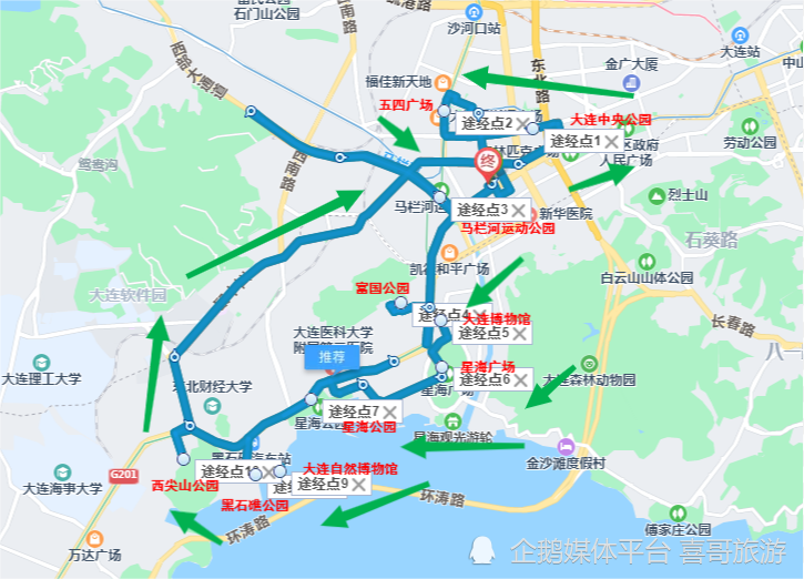 2、推荐沙河口区景点自驾游行程路线:沙河口区-大连中山公园-大连五四广场-马栏河运动公园-富国公园-大连博物馆-星海广场-星海公园-黑石礁公园-大连自然博物馆-西尖山公园-沙河口区。